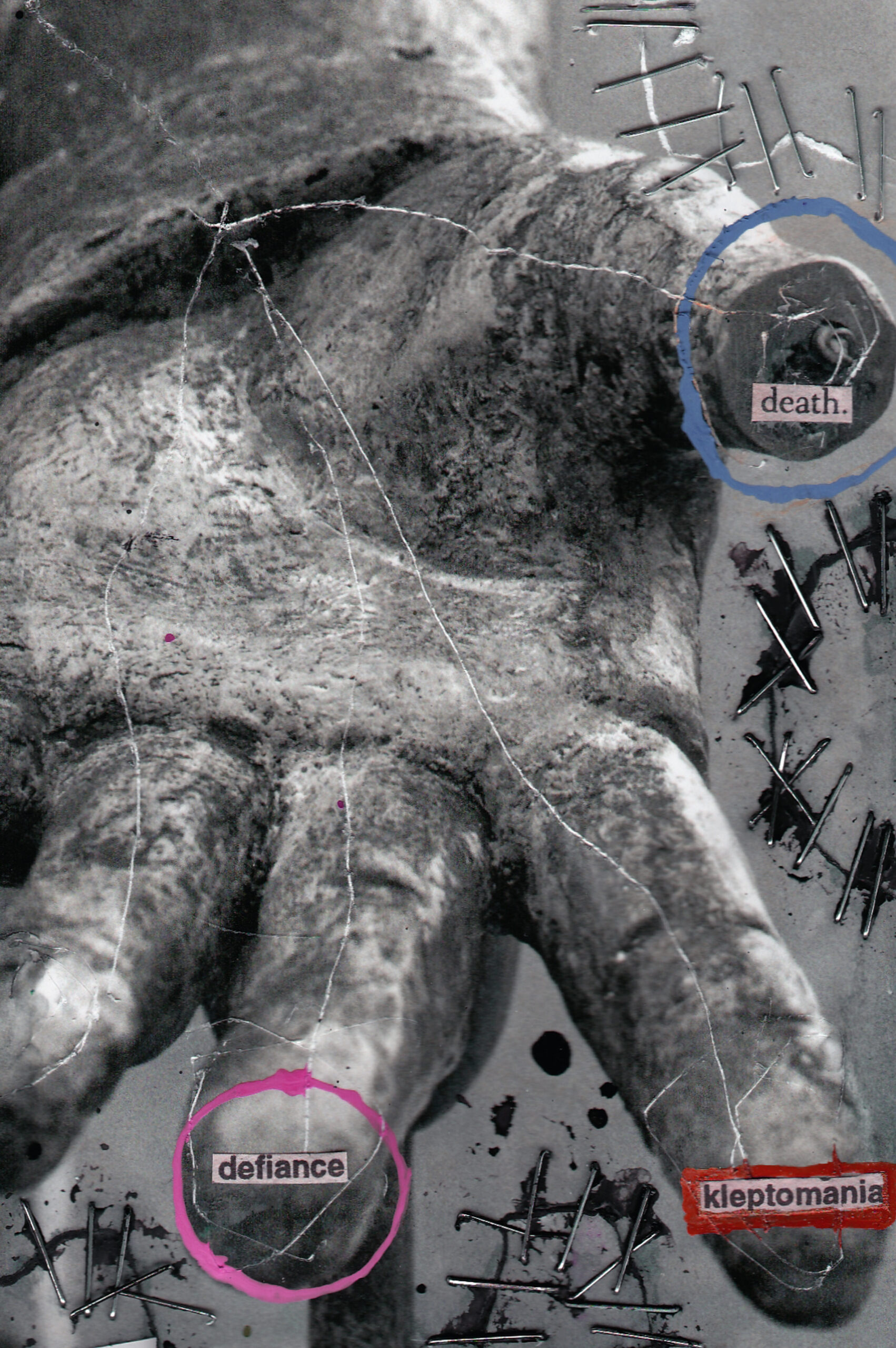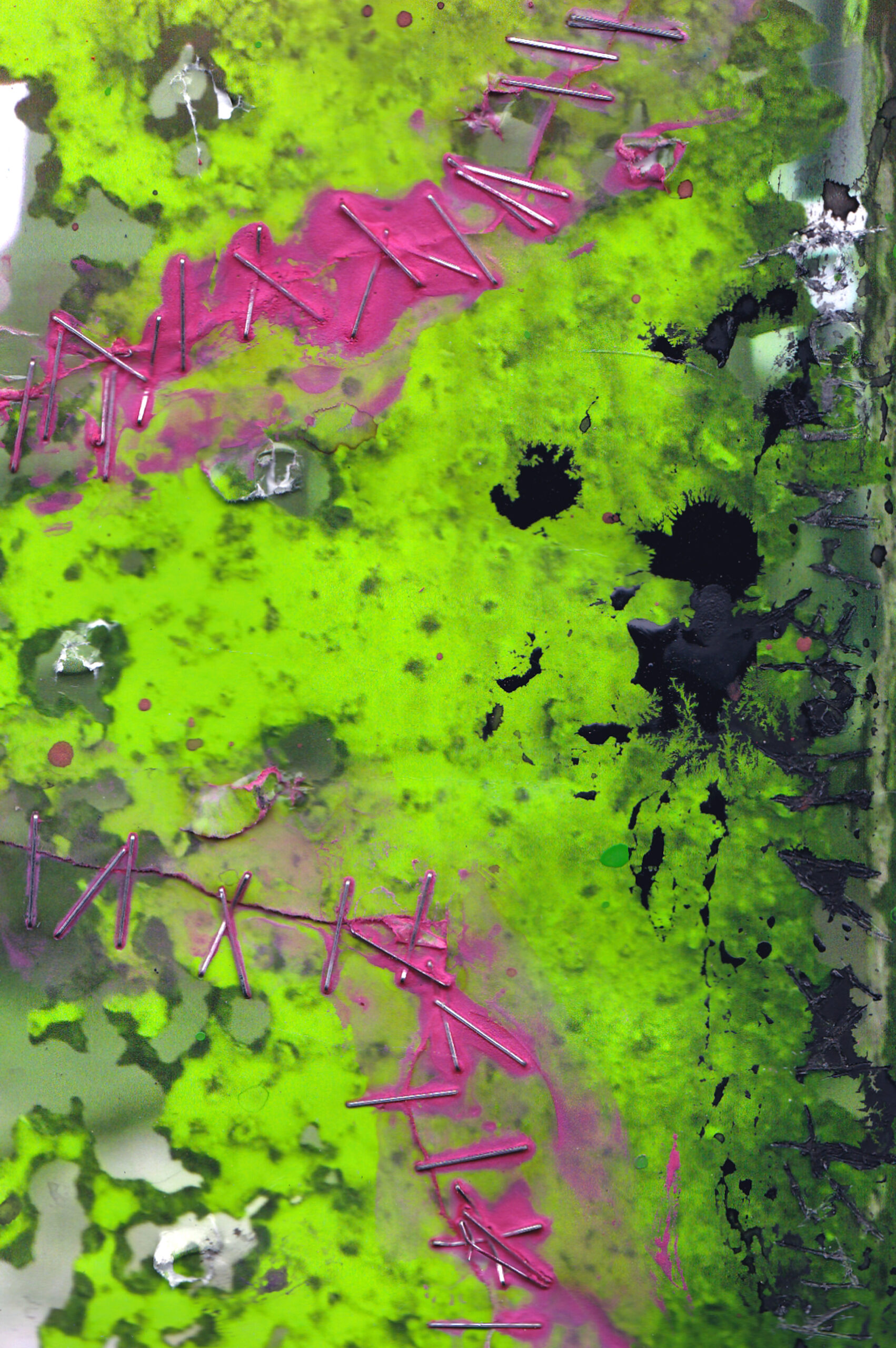 My artwork has the basic overall theme of “total creative destruction.” I’ve taken my own photographs that I mainly take while walking the streets of my town, while on vacation, or riding my bicycle late at night. Then, I get prints of my photographs made and I take the original prints of various sizes and defile and deform them into something different. I pretty much exclusively do this with an assortment of random and common household items and products, as varied as drywall screws, nails, cleaning bleach, staples, watercolor paint, duct tape, etc. I basically transform and make new art from already existing photographic art. Nothing I make will be perfect when partaking in the chaotic creative process, nor is it meant to be. I don’t go into making this kind of abstract art with a plan or any sort of idea how the finished product will truly look. The new art could come out in the end as anything, really, it truly is random and sporadic chaos, which adds to its appeal and originality.
