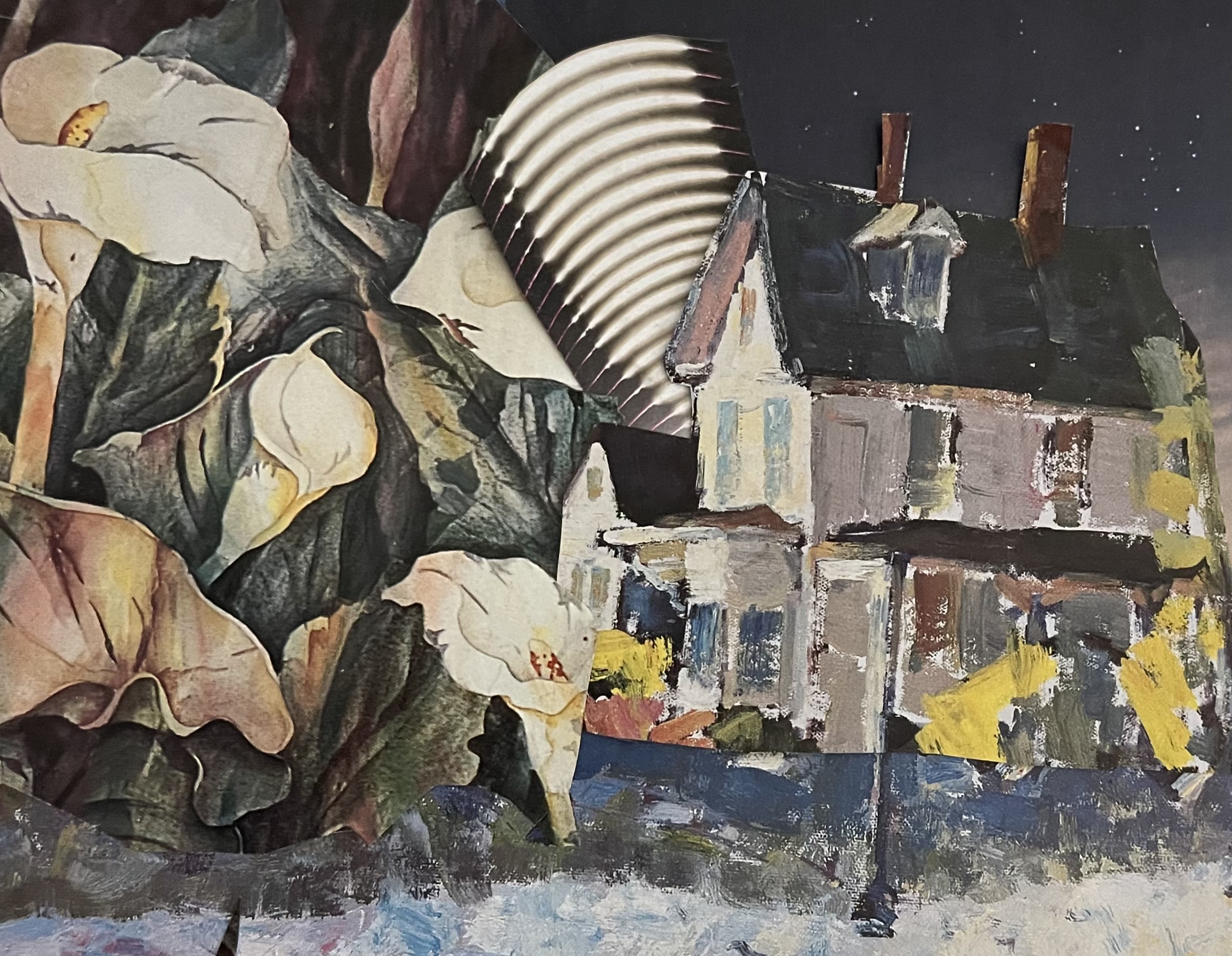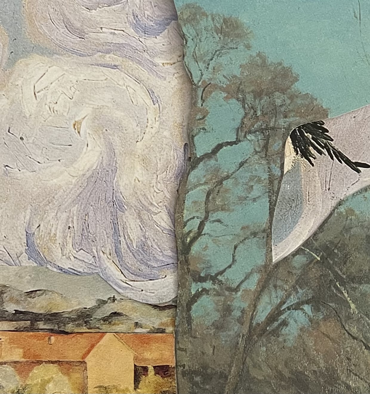 The act of collaging for me can sometimes border on the impulsive. Sitting on my soft yellow couch, I will often begin flipping through sourced magazines until something piques my interest and off I go with a pair of scissors, slicing the image haphazardly from the page. I delve through the stacks of collected source materials to complete the image I have in mind. Finishing the whole thing off with a title that helps to narrate what I see in the collaged work in front of me. Much of my daily collage work is small, not bigger than an 8”x10”, and held together under plastic laminate. They resemble postcards, artistic mementos from my life, with a small love letter title letting you in on a secret sealed up under a thin layer of plastic.